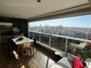 MOBILIADÍSSIMO, apto um dormitório com uma vaga de garagem coberta, com ar condionado, ventilador de teto, cama, criado mudo, abajur, geladeira frost free, microondas, fogão, depurador de ar, máquina lava roupa, chuveiro, capacho de entrada,...