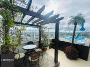 ...Cobertura com com 4 dormitórios, sendo um suíte, amplo living, com lareira, lavabo, sacada integrada, cozinha americana, área de serviço e dependência completa. Piso superior com a segunda lareira, área gourmet com churrasqueira, um deck com piscina...